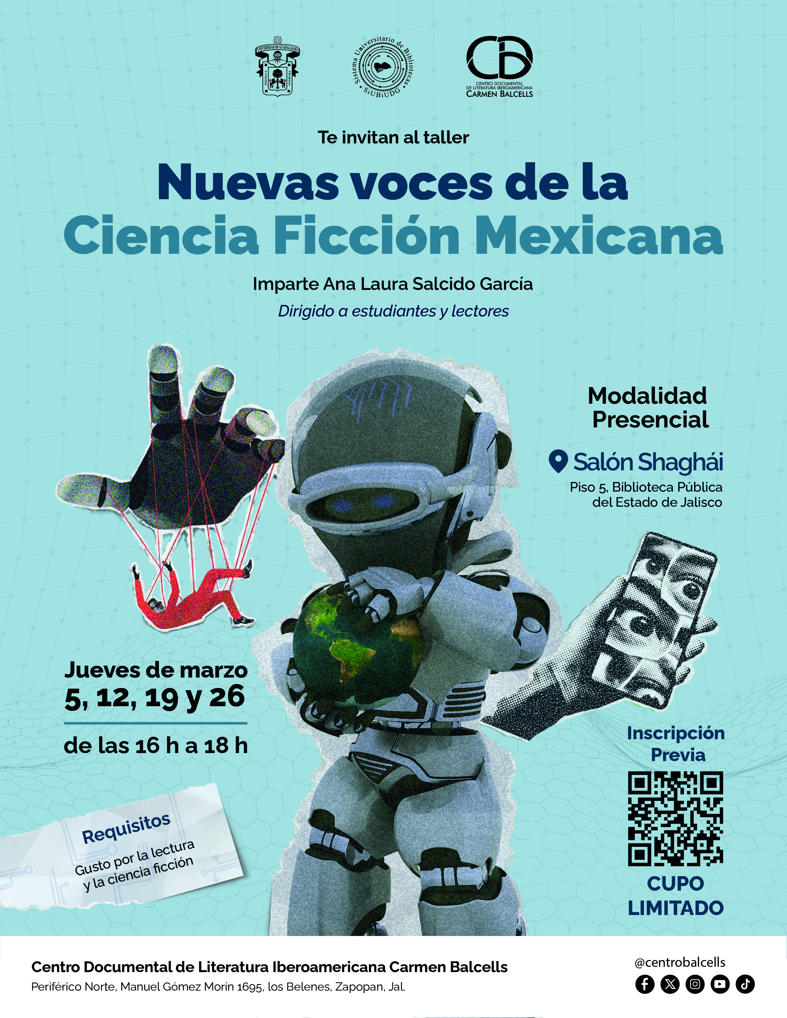 El Centro Documental de Literatura Iberoamericana Carmen Balcells extiende una cordial invitación a participar en el taller: Nuevas voces de la ciencia ficción mexicana, a cargo de la Lic. Ana Laura Salcido García de la Maestría en Estudios de Literatura Mexicana.
