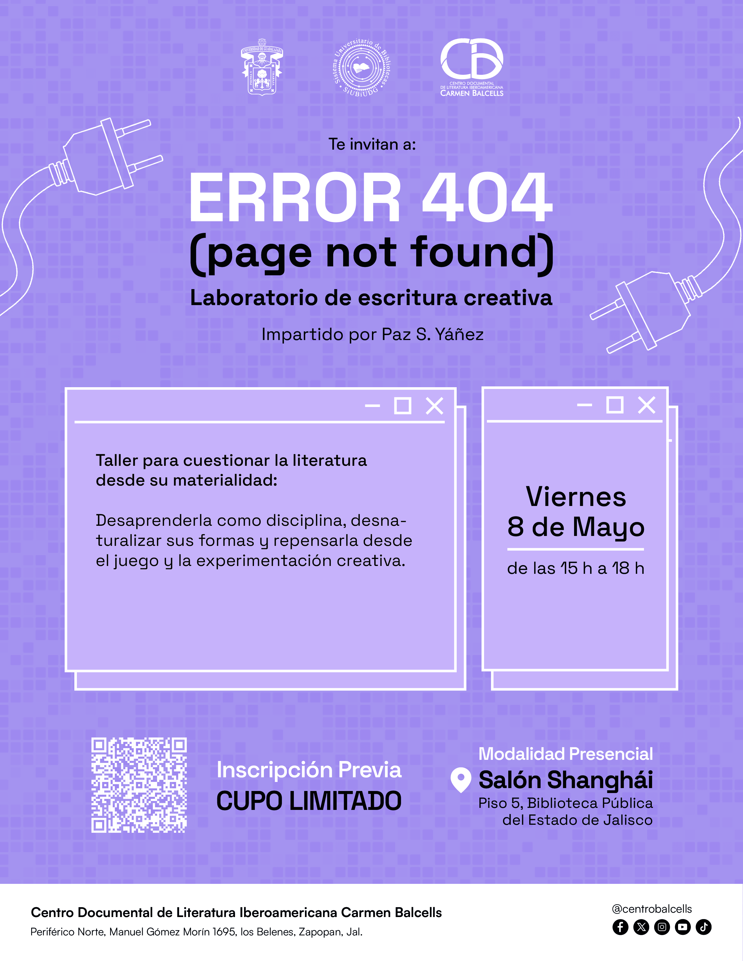 El Centro Documental de Literatura Iberoamericana Carmen Balcells los invita al taller Error 404 (page not found): Laboratorio de escritura creativa impartido por Maripaz Sánchez Yáñez, que se llevará a cabo el viernes 8 de mayo del presente año, de 15:00 a 18:00 horas, en el Salón de Usos Múltiples Shanghái, ubicado en el quinto piso de la Biblioteca Pública del Estado Juan José Arreola. Periférico Norte Manuel Gómez Morín #1695, Colonia Los Belenes, Zapopan, Jalisco, México.